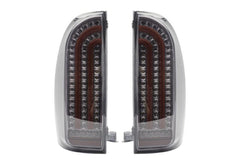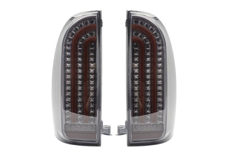 These Toyota Tacoma LED taillights are with four LED tubes as parking light, with red LED in between the light tubes as a brake light and standard blinking turn signal light. The reverse light is located at the bottom and you can apply your stock halogen light bulbs.